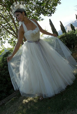 Meet YOLANDA. Inspired by an old MGM musical, this dress is layered in yards of tulle and crinoline. The bodice is a close fit covered in Chantilly lace appliques with an overlay of shirred tulle. The rosy tint of the tulle is the result of a tea dye. I cinched the waist with a gray satin belt. This dress is available via special order through Amy-Jo Tatum Bridal